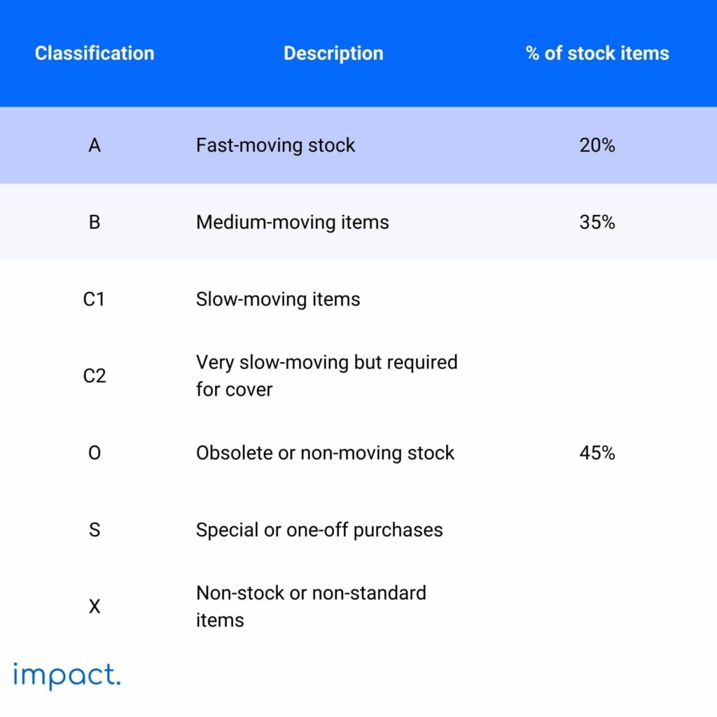 Manajer gudang memiliki peran untuk memberikan saran kepada staf inventory mengenai tingkat stok pengaman serta pergerakan dan karakteristik barang. Manajer dapat memperluas klasifikasi normal untuk memasukkan stok yang tidak bergerak dengan mengidentifikasi stok yang tidak membutuhkan penyimpanan tetapi dapat dikirim langsung dari supplier. Klasifikasi ini dapat ditunjukkan pada tabel di bawah: