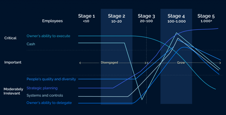 Untuk perusahaan di Tahap 1 dan 2, kemampuan pemilik untuk mengeksekusi dan arus kas sangat penting dalam memastikan kelangsungan hidup perusahaan, sementara yang lainnya tidak terlalu relevan.