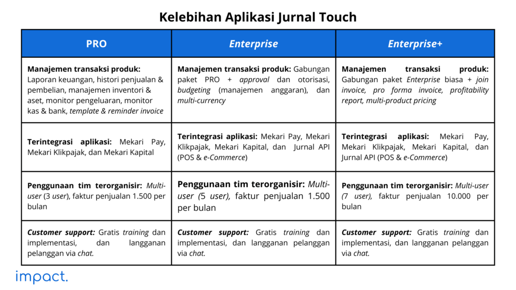 Perlu Anda ingat bawah isi paket, fitur, dan harga jual dapat berubah sesuai dengan kondisi. Jurnal Touch dapat diakses dalam bentuk mobile app (iOS dan Android) atau melalui website.