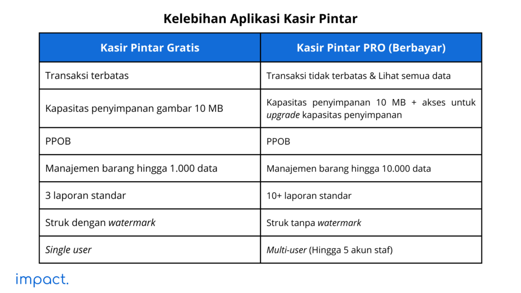 Berikut kelebihan Kasir Pintar versi gratis dan berbayar: