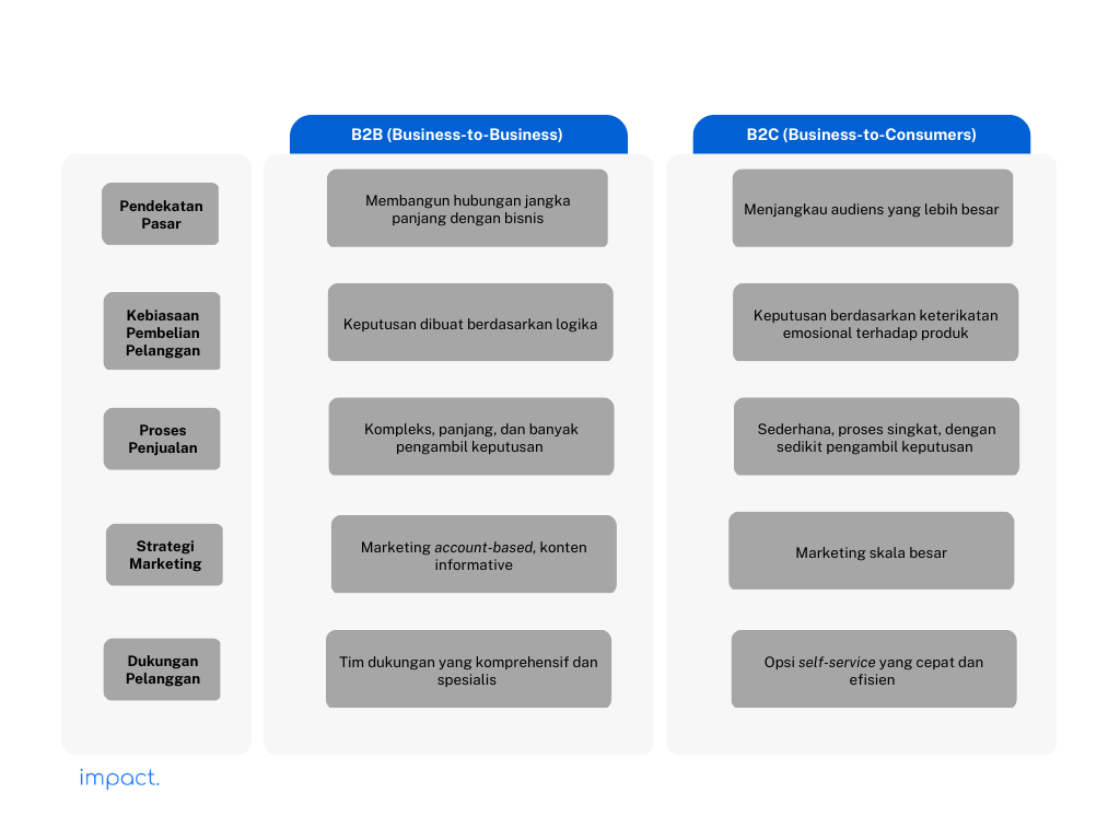 B2B dan B2C memiliki strategi pasar yang berbeda. B2B memprioritaskan pemahaman terhadap kebutuhan dan perilaku target audiens industri mereka.