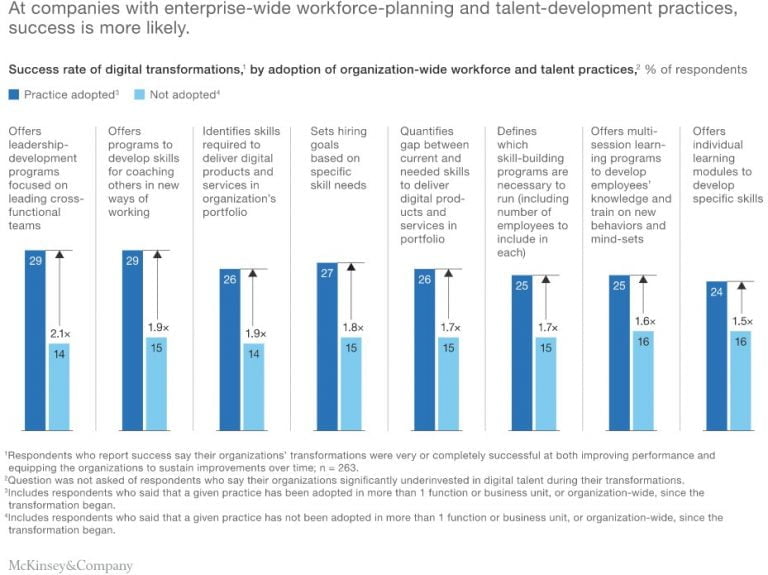Keberhasilan juga lebih mungkin terjadi ketika organisasi meningkatkan perencanaan tenaga kerja dan pengembangan bakat mereka seperti yang ditunjukkan di bawah ini.