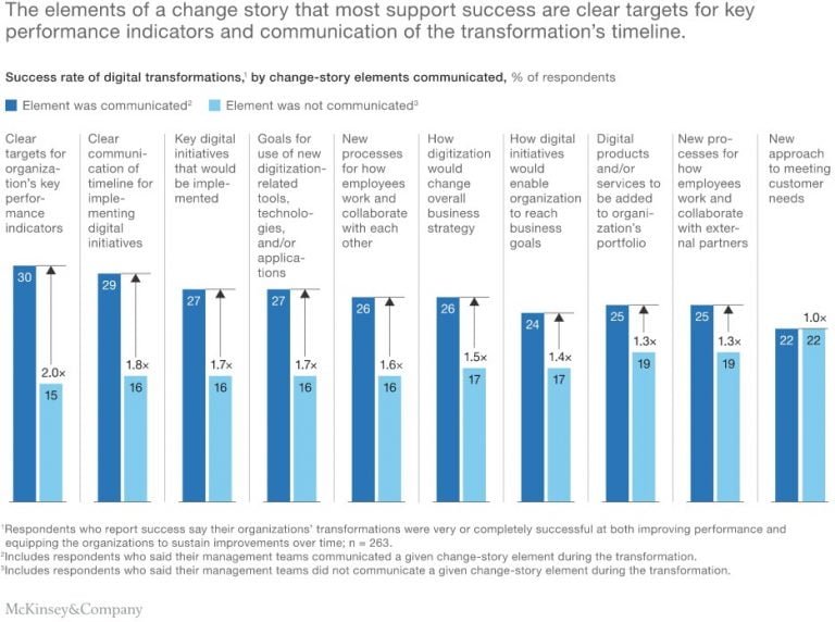Singkatnya, semakin banyak perusahaan Anda menggunakan teknologi, dan semakin kecil perusahaan Anda, semakin besar kemungkinan Anda akan berhasil dalam transformasi digital. Lihat di bawah untuk faktor kunci keberhasilan transformasi digital menurut McKinsey.