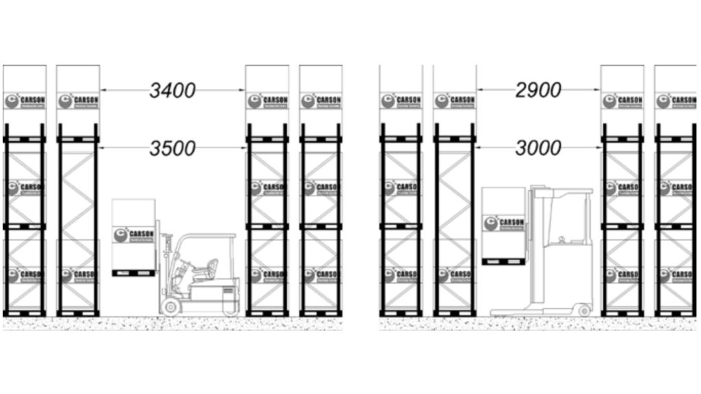 Jarak aman 100 mm di kedua sisi (total 200 mm) dari palet tipikal perlu ditambahkan untuk memastikan penyimpanan dan pengambilan palet yang cepat. Dimensi kedua adalah lebar keseluruhan truk saat berjalan di sepanjang lorong penumpukan.