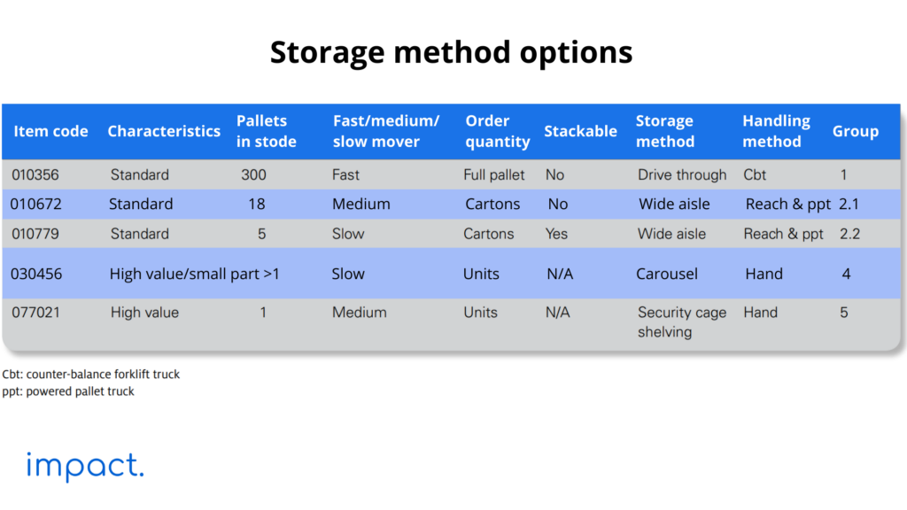 Tabel berikut menunjukkan karakteristik masing-masing item stok dan kemungkinan media penyimpanan yang dipertimbangkan. Tabel berikut juga mencatat informasi sebanyak mungkin mengenai profil penyimpanan dan pemesanan produk yang terdaftar. Ini memberi kesempatan untuk memutuskan media penyimpanan dan penanganan yang paling sesuai.