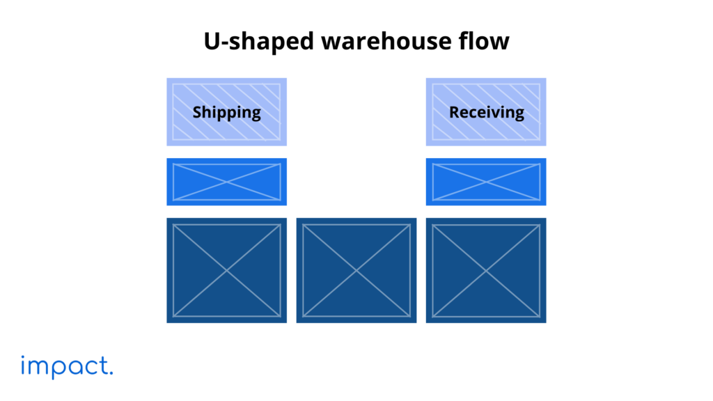 Flow gudang berbentuk U adalah yang paling umum digunakan oleh perusahaan. Ini telah diakui sebagai tata letak terbaik untuk gudang pemula. Semua komponen diatur dalam setengah lingkaran dengan pengiriman dan penerimaan di sisi paralel dan penyimpanan di tengah.