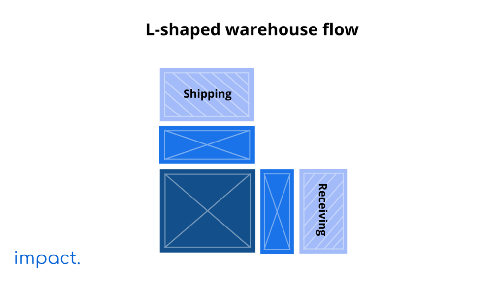 Bentuk L juga meminimalkan kemacetan dengan menghindari pergerakan bolak-balik dan secara efektif memisahkan produk dengan dok masuk dan keluar di sisi yang berlawanan. Kerugian paling signifikan dari desain gudang berbentuk L adalah membutuhkan banyak ruang untuk menjalankan aliran ini secara efektif.