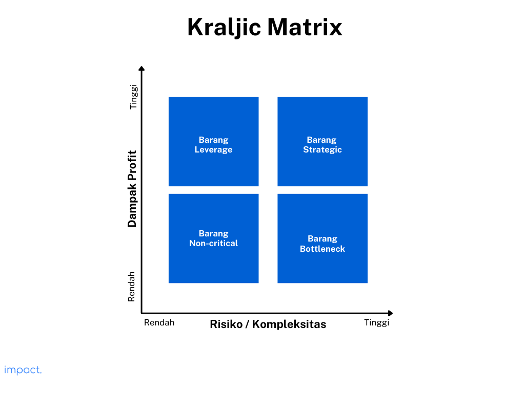 Metode populer lainnya yang bisa digunakan untuk mengelompokkan pemasok lebih jauh adalah Kraljic Matrix. Metode ini memungkinkan perusahaan untuk mengkategorikan pembelian berdasarkan risiko dan kepentingan bisnis.