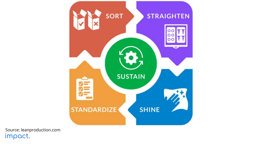 5S adalah cara terbaik untuk meminimalkan waste Lean. Pendekatan ini memungkinkan perusahaan untuk memiliki tempat khusus dalam menyimpan barang, sehingga karyawan dapat menggunakan, menemukan, dan mengembalikan barang tersebut dengan mudah. Selain itu, penerapannya juga membantu tempat kerja menjadi lebih rapi dan accessible.